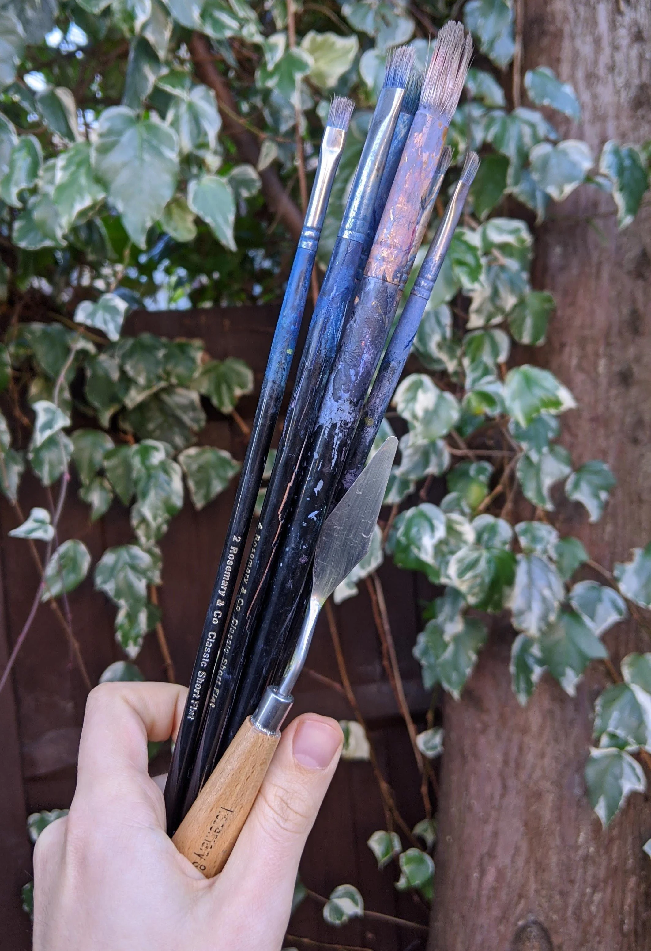 The brushes I use are by Rosemary and Co. As I am a quick and expressive painter, I tend to opt towards a hard bristle brush as they can take some abuse and are perfect for scrubbing and flicking paint around without getting damaged. I also paint with palette knives, which are a fantastic tool that I have begun using more often in recent years, as they allow me to scoop up large quantities of paint and apply thick impasto effects. The combination of brushes and knives leaves distinct marks on the painting surface, providing the viewer with a range of exciting textures to explore.