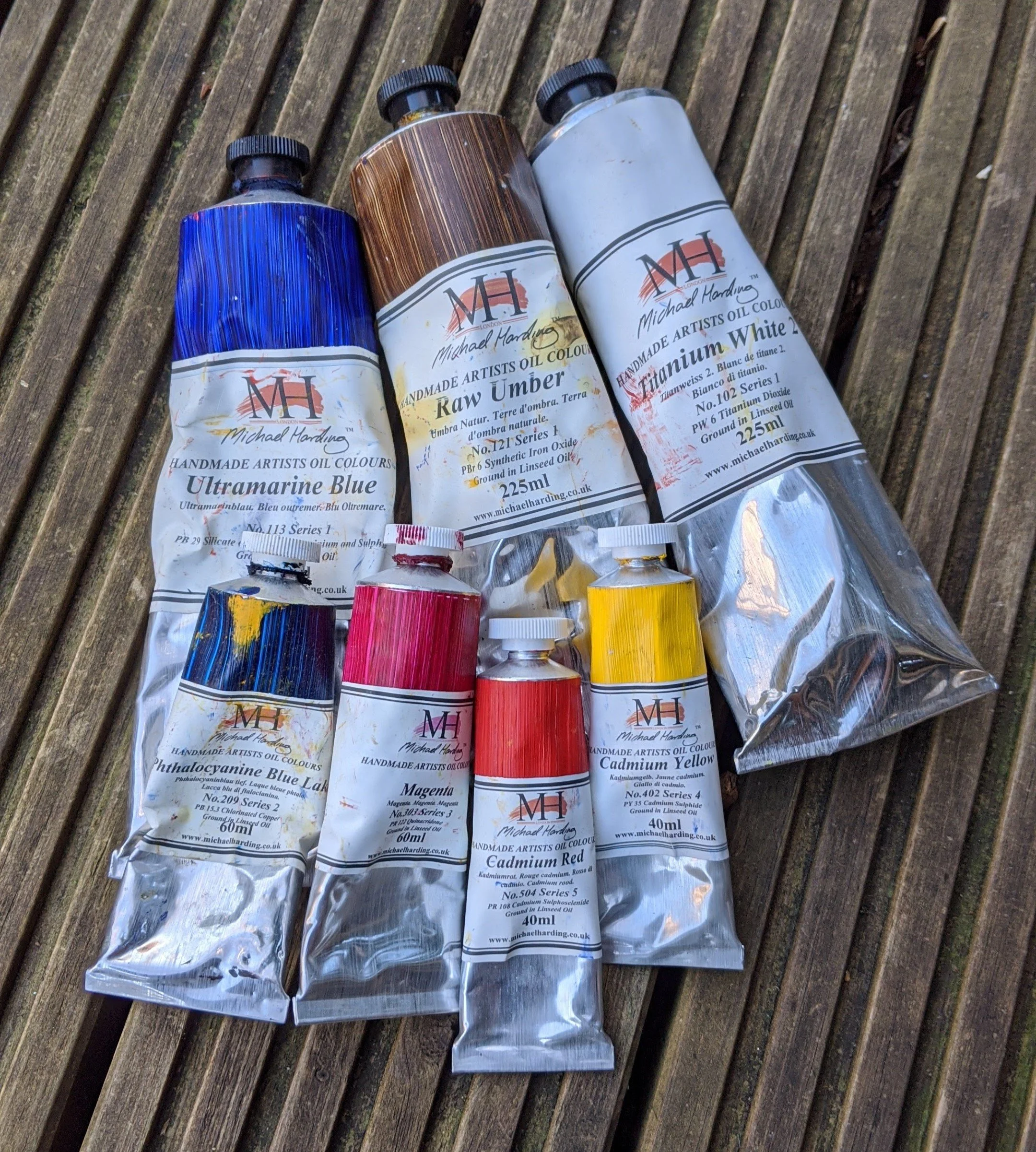 The paints I use are by Michael Harding as well as Winsor and Newton, which contain the finest pigments. They are created by grinding gemstones and minerals from the earth and mixing them with linseed oil. The outcome is a thick and buttery consistency full of vibrant and true colours. These paints help me to achieve landscape paintings that glow and vibrate with a range of magnificent hues.